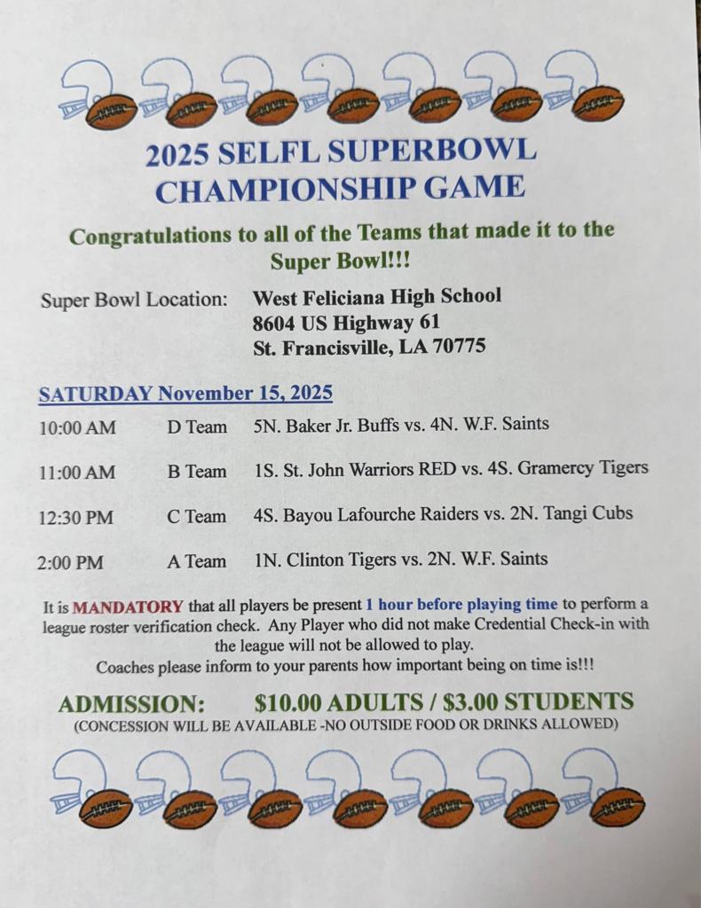 Thank you for visiting SELFL page. We take pride in youth developmental football. All of our coaches are required to be USA football Certified Coaches and Staff. Our Teams are among the finest teams in southern Louisiana.